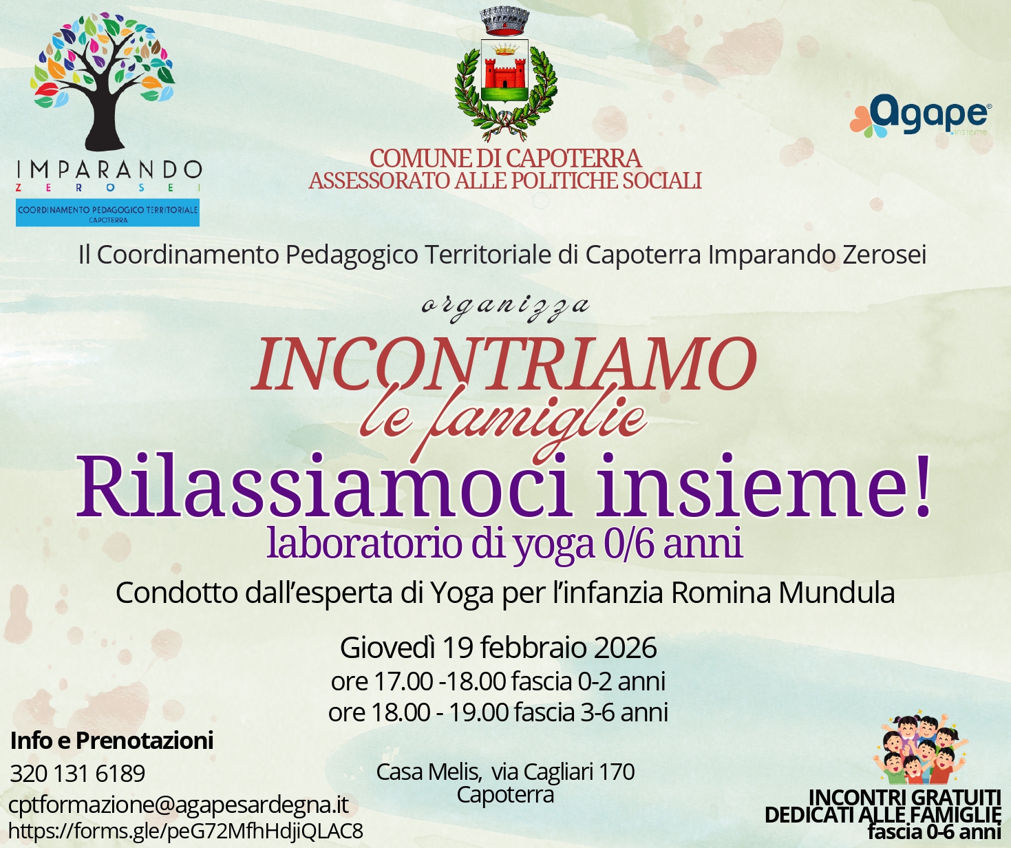 Il Comune di Capoterra, attraverso l’Assessorato alle Politiche Sociali e il Coordinamento Pedagogico Territoriale Imparando Zerosei, organizza incontri gratuiti dedicati alle famiglie con bambini dai 0 ai 6 anni.