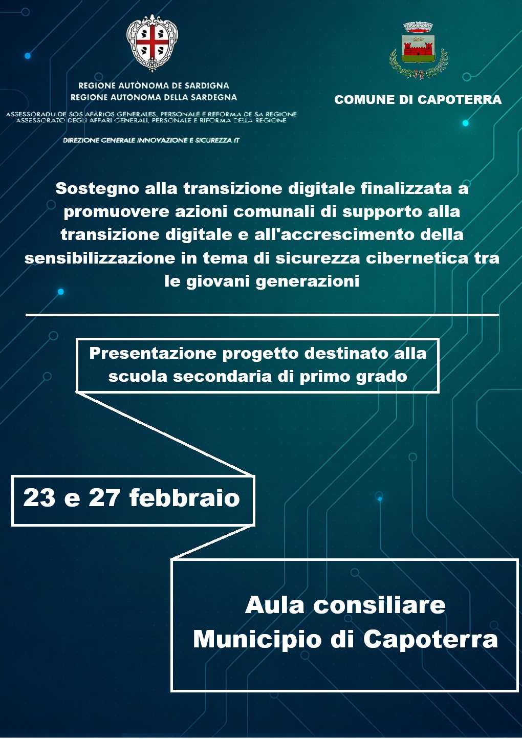 Il 23 e 27 febbraio sarà presentato presso l’Aula Consiliare del comune di Capoterra il Progetto “AZIONI COMUNALI DI SUPPORTO ALLA TRANSIZIONE DIGITALE E ALL'ACCRESCIMENTO DELLA SENSIBILIZZAZIONE IN TEMA DI SICUREZZA CIBERNETICA TRA LE GIOVANI GENERAZIONI” finanziato dalla Regione Sardegna con L.R. 24/2025 art. 16 c. 6.