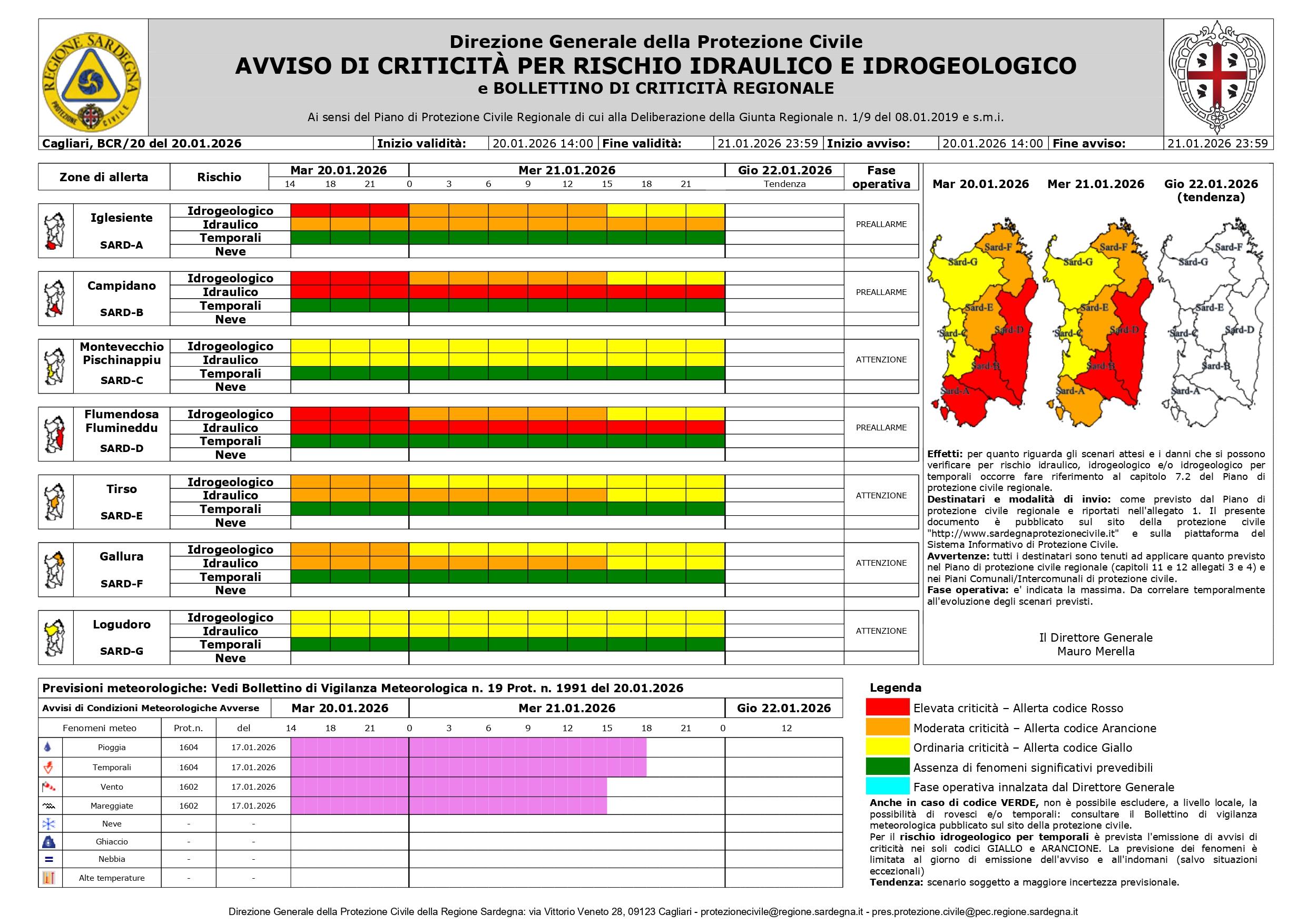 A partire dalle ore 00:00 del 21 gennaio 2026 e fino alle 23:59 del 21 gennaio 2026, un avviso di allerta per Codice ARANCIONE (criticità MODERATA) per RISCHIO IDROGEOLOGICO E IDRAULICO sull'area di allerta Iglesiente.