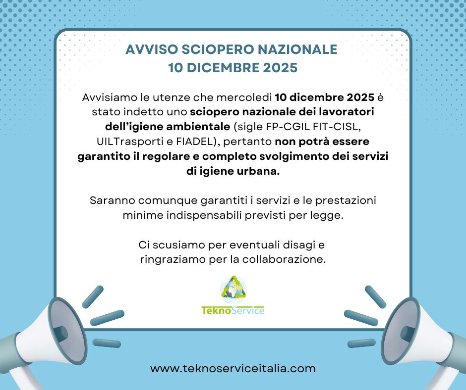Avvisiamo le utenze che mercoledì 10 dicembre 2025 è stato indetto uno sciopero nazionale dei lavoratori dell' igiene ambientale, pertanto non potrà essere garantito il regolare e completo svolgimento dei servizi di igiene urbana.