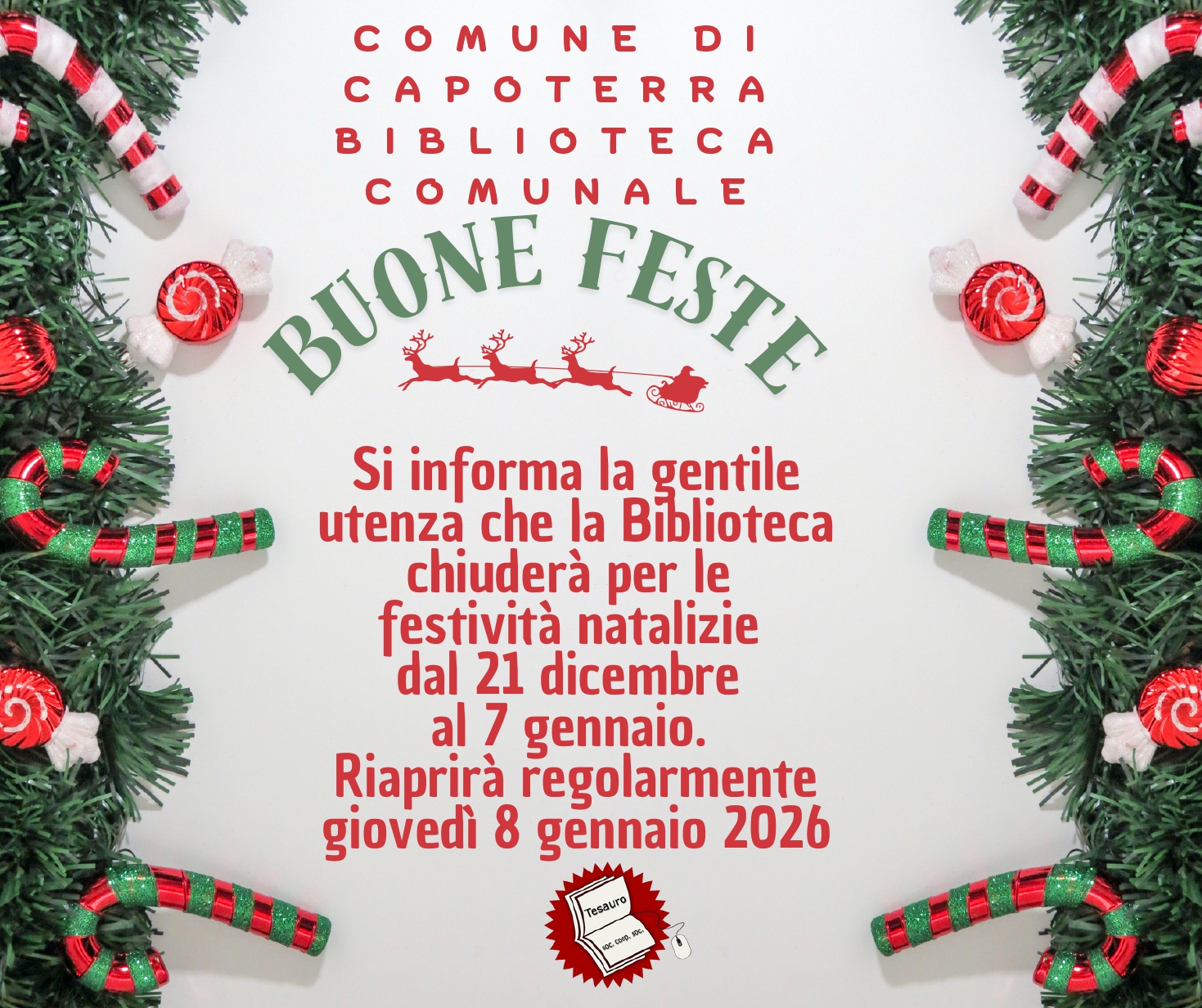 Si informa la gentile utenza che la biblioteca chiuderà per le festività natalizie dal 21 dicembre al 7 gennaio.