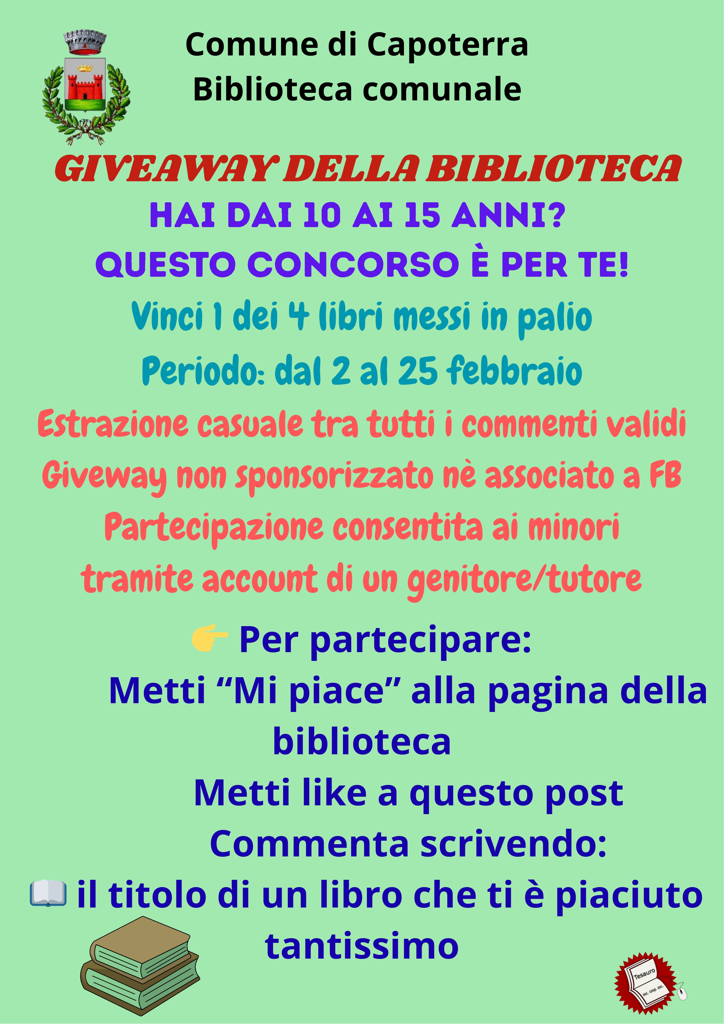 La Biblioteca comunale di Capoterra lancia un giveaway dedicato ai ragazzi dai 10 ai 15 anni: in palio 4 libri. Per partecipare basta mettere like alla pagina e al post e commentare con il titolo di un libro amato